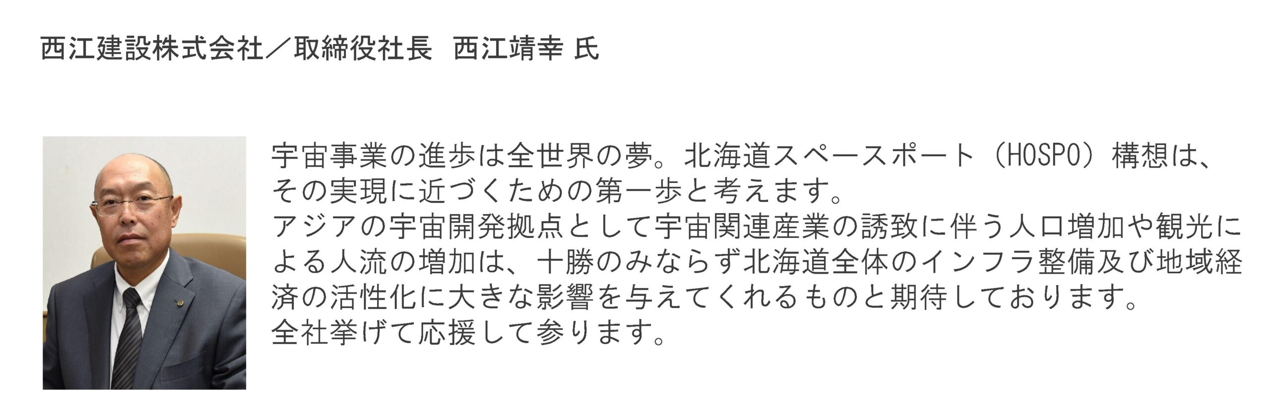 2021年7月30日 最新情報 西江建設㈱は大樹町による宇宙港「北海道スペースポート(HOSPO)」構想に賛同し、同社に1,000万円の出資を行いました。 (以下、SPACE COTAN㈱プレスリリースより当社社長コメント) 詳細は下記リンクよりご覧いただけます。 民間にひらかれた宇宙港「北海道スペースポート」の事業運営会社SPACE COTAN、北海道スペースポートを応援するコミュニティ”HOSPO SUPPORTERS”設立|SPACE COTAN株式会社のプレスリリース (prtimes.jp)